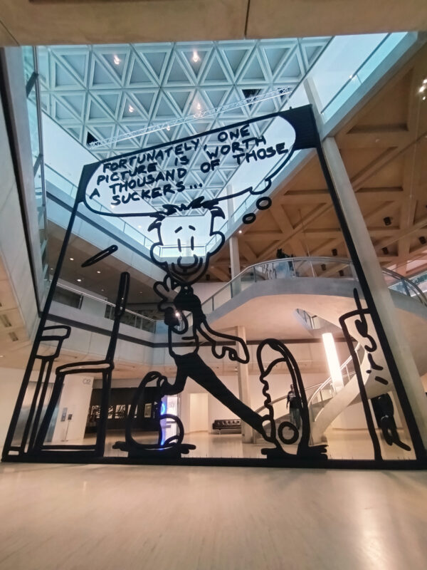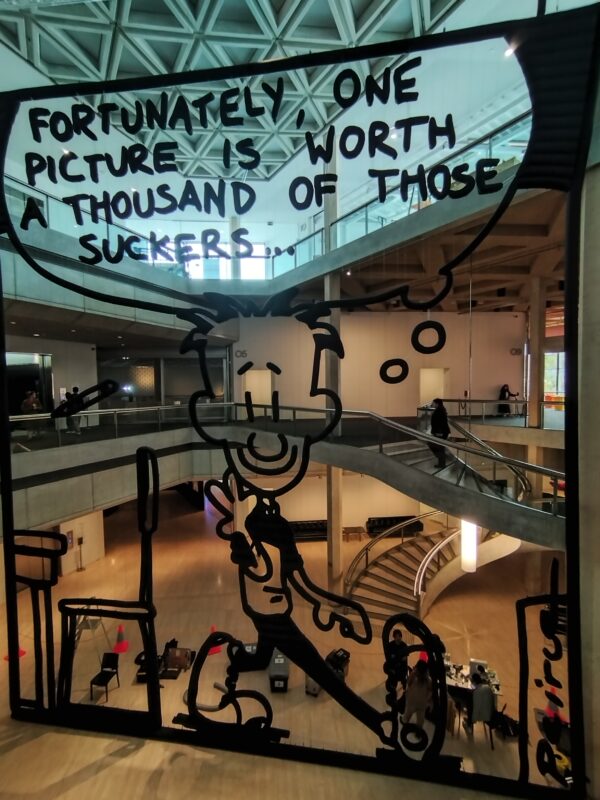 この展覧会の顔となる高さ13m以上、幅12mの新作『Fortunately, one picture is worth a thousands of these suckers…(homage to Lincoln Peirce)』を作品をアーティストと一緒に製作することになった。この作品は著名なアメリカの漫画家、リンカーン・ピアースの『ビッグ・ネイト』のコミックのひとこまを元にしている。この作品は化学工学科の学生であったピヴィがアーティストへと転身する過程で重要な役割を果たしたコミックという形式に敬意を表した作品とのことである。